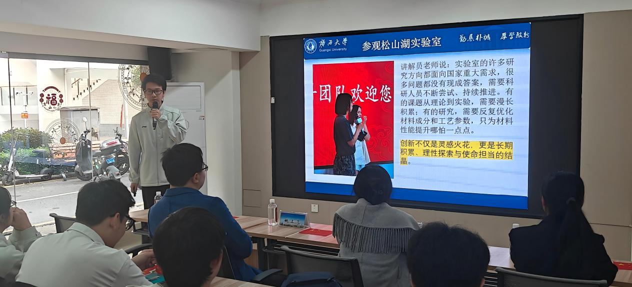 随后,2024级本科生黄琼锋同学以“松山湖之旅,照亮我的材料科学之路”为主题分享了她在松山湖材料实验室见到高温超导材料、阿秒激光等科技成果。她说:“此次松山湖之旅,让我近距离感受到了人民科学家赵忠贤院士的科学家精神,更加坚定了我未来攻读材料学科研究生的信心。未来,我将结合家乡广西的资源优势和产业需求,开展相关科学研究,为建设壮美广西的科技创新事业贡献自己的力量。”